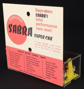 This garage style box comprises a hard plastic clear case with intact and complete garage door and yellow plastic base. Pristine header card. With period price label.