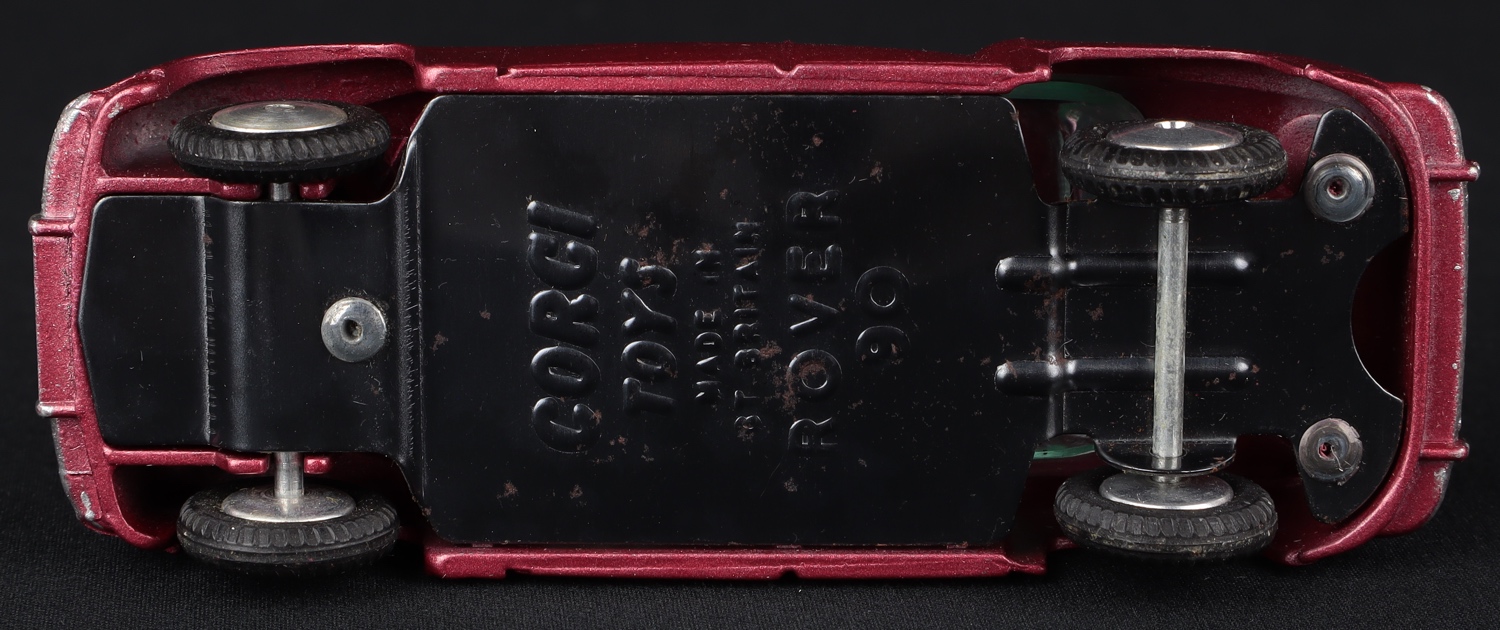 Rover 90 Saloon by Corgi Toys, No. 204. Later two tone issue in metallic cerise & ivory, flat spun wheels. Very near mint/boxed. From The Rickman Collection.