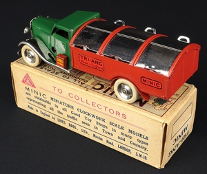 Dust Cart by Tri-ang Minic Models. PRE-WAR, long bonnet version. A rare find, especially in this condition. Working clockwork motor. Very near mint /boxed. Starting bid £350. Please note that QDT apply 12.5% buyer's commission.