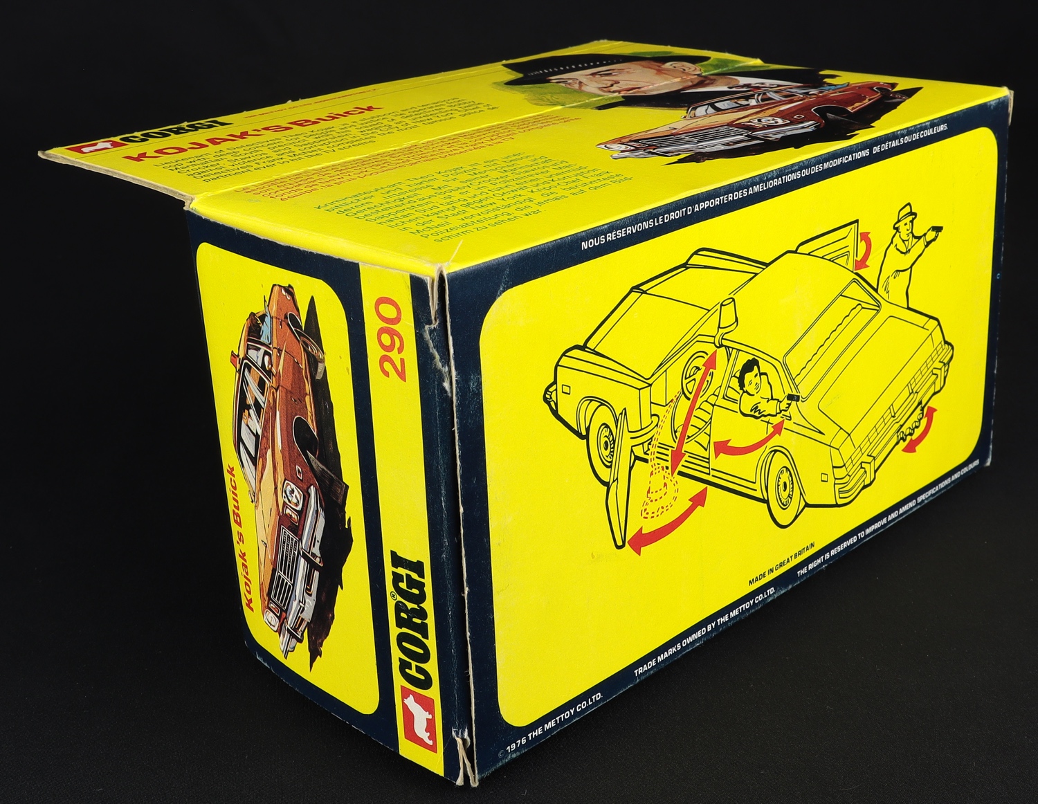Kojak's Buick by Corgi Toys, No. 290. Mint/boxed. DARK BRONZE VERSION. Issue with 'NEW' Tag & polystyrene base with card backdrop. With both figures of Kojak & Crocker. Badge. From The Wesley Lodge Collection.