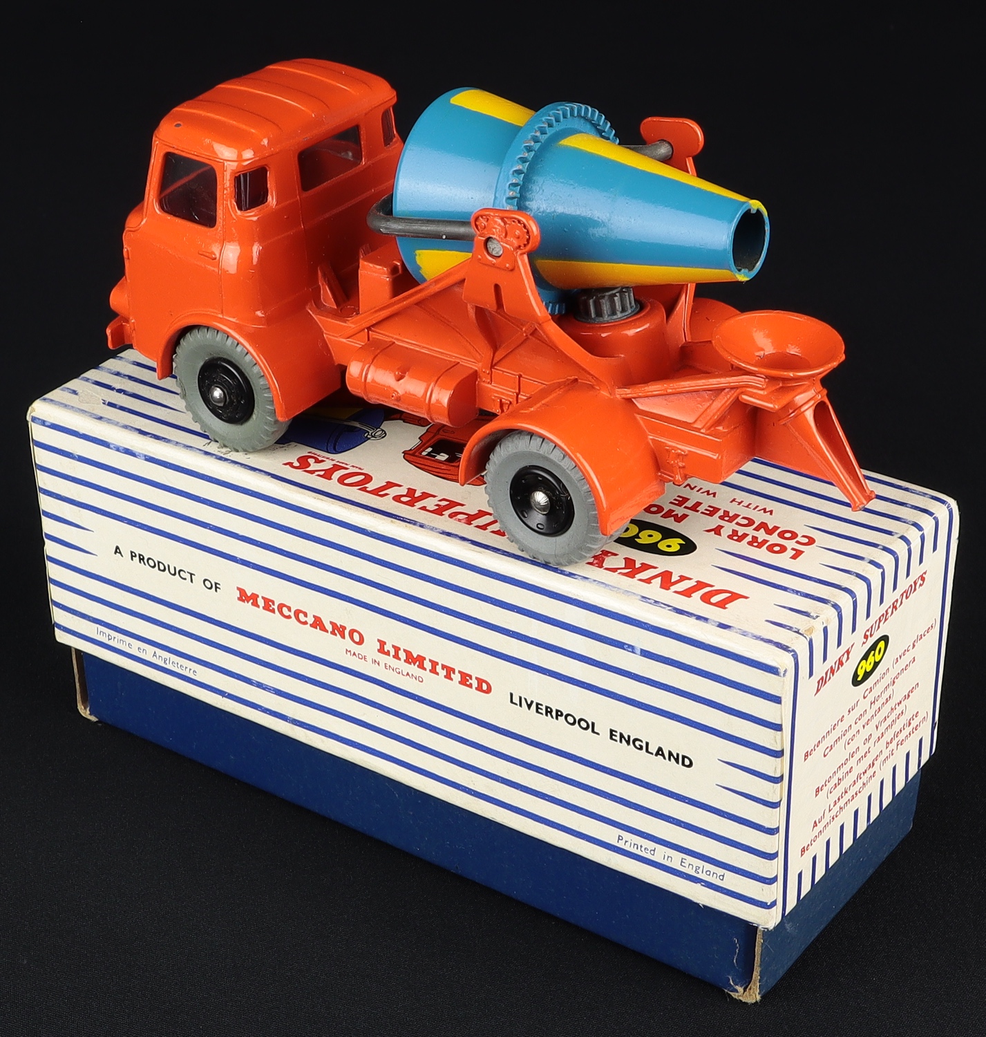 Lorry-Mounted Concrete Mixer, with windows by Dinky Toys. No.960. Blue & yellow rotating drum. Grey tyres, GLOSSY base. Very near mint/boxed. From The Fenman Collection.