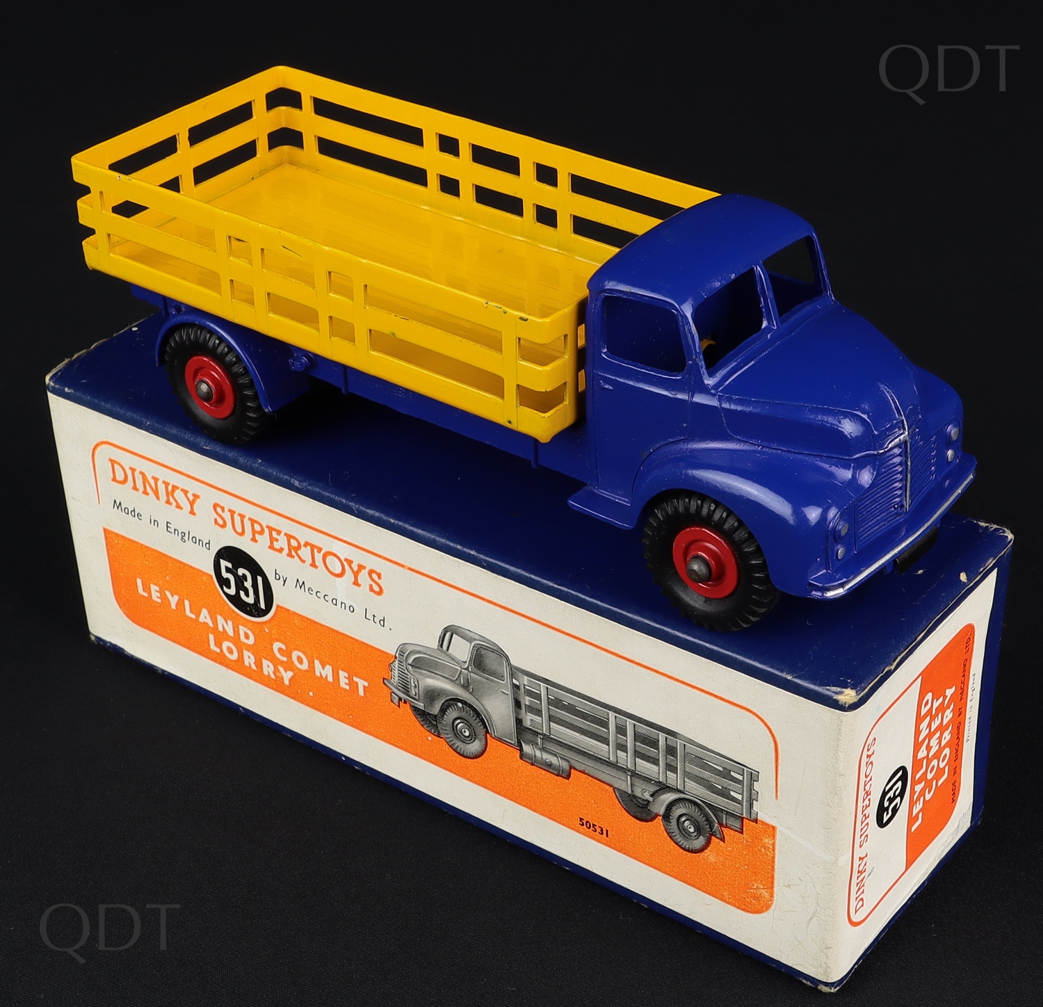 Leyland Comet Lorry by Dinky Supertoys, No. 531. Very near mint/boxed. Deep blue and orange-yellow version, grooved Supertoy wheels. From The Coastline Collection.