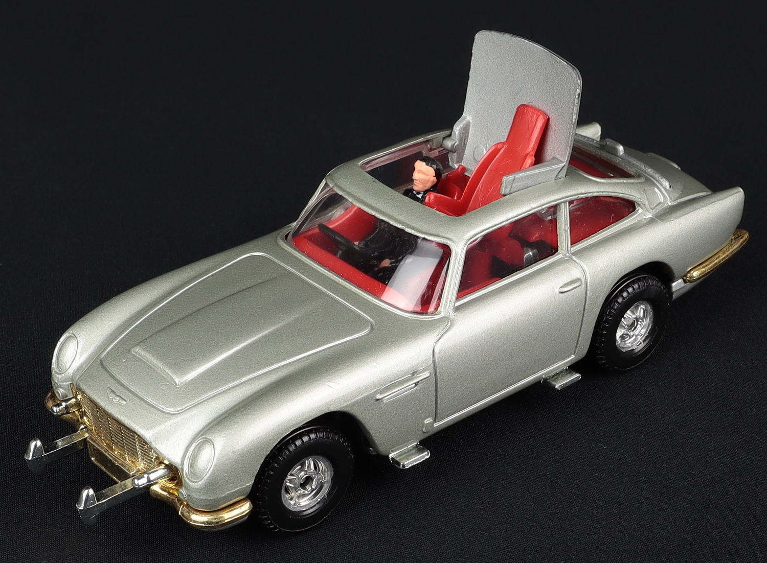 This James Bond Aston Martin, finished in bright metallic silver has a red interior and gold radiator & bumpers. Version with four-spoke detail Whizzwheels. This example has both levers in silver. Bullet shield is silver.