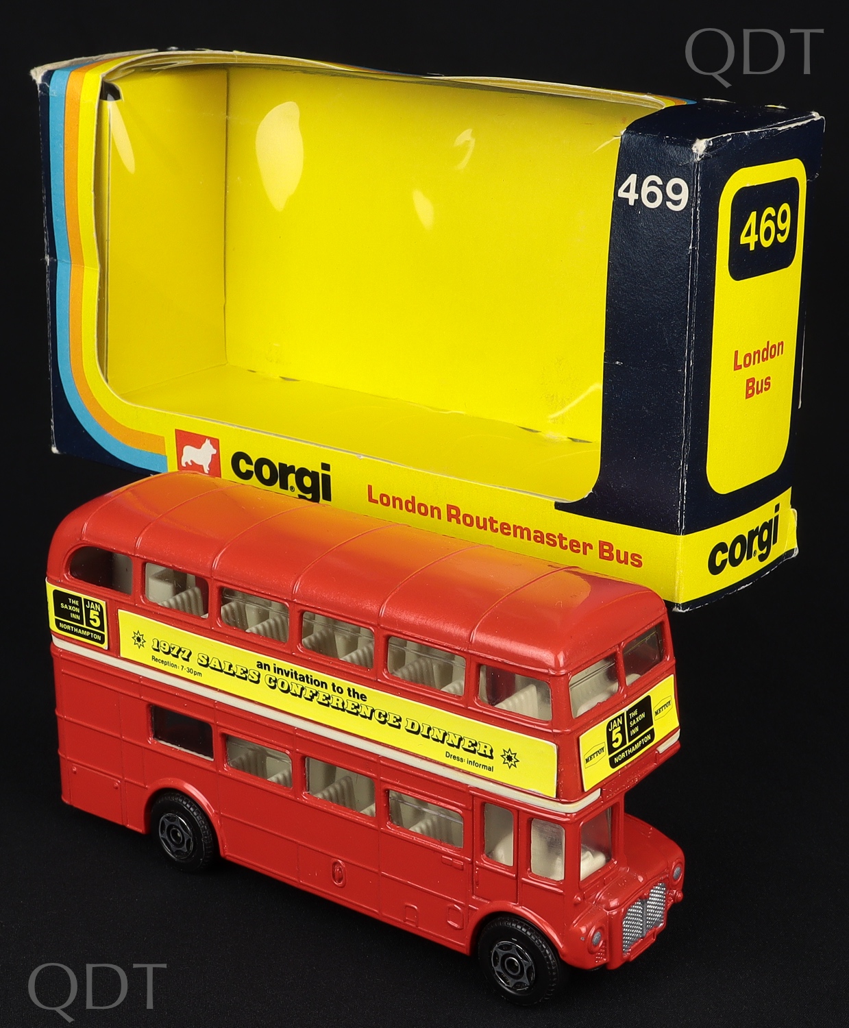 London Bus '1977 Sales Conference Dinner' by Corgi Toys, No. 469. Rare. Very, very near mint/boxed. From The Wesley Lodge Collection. QDT starting bid £150. Please note that QDT apply 12.5% buyer's commission.