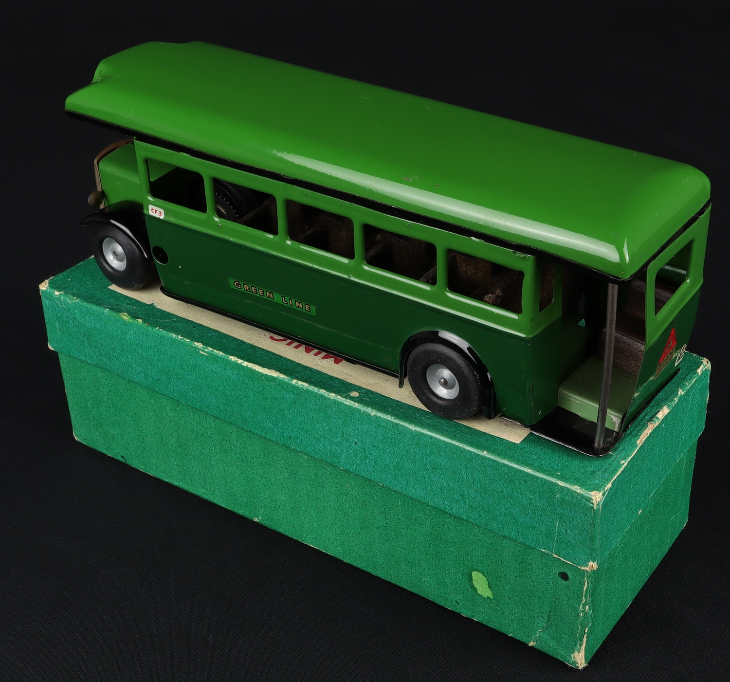 Single Deck Bus by Tri-ang Minic 52M. Two-tone green. 'Green Line'. Working clockwork function. Very near mint/boxed, with MInic Key. From 1949. Scarce green lift-off lid box. From The Coastline Collection.