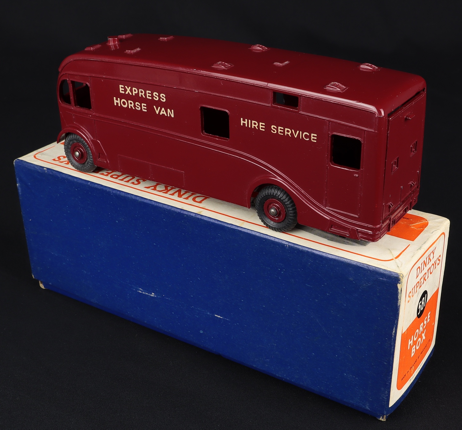 Horse Box by Dinky Toys, No. 581. Early U.S. export issue. Rare issue in maroon with maroon wheels. Near mint plus/boxed with packing wedge. Rare model from The Reference Collection.
