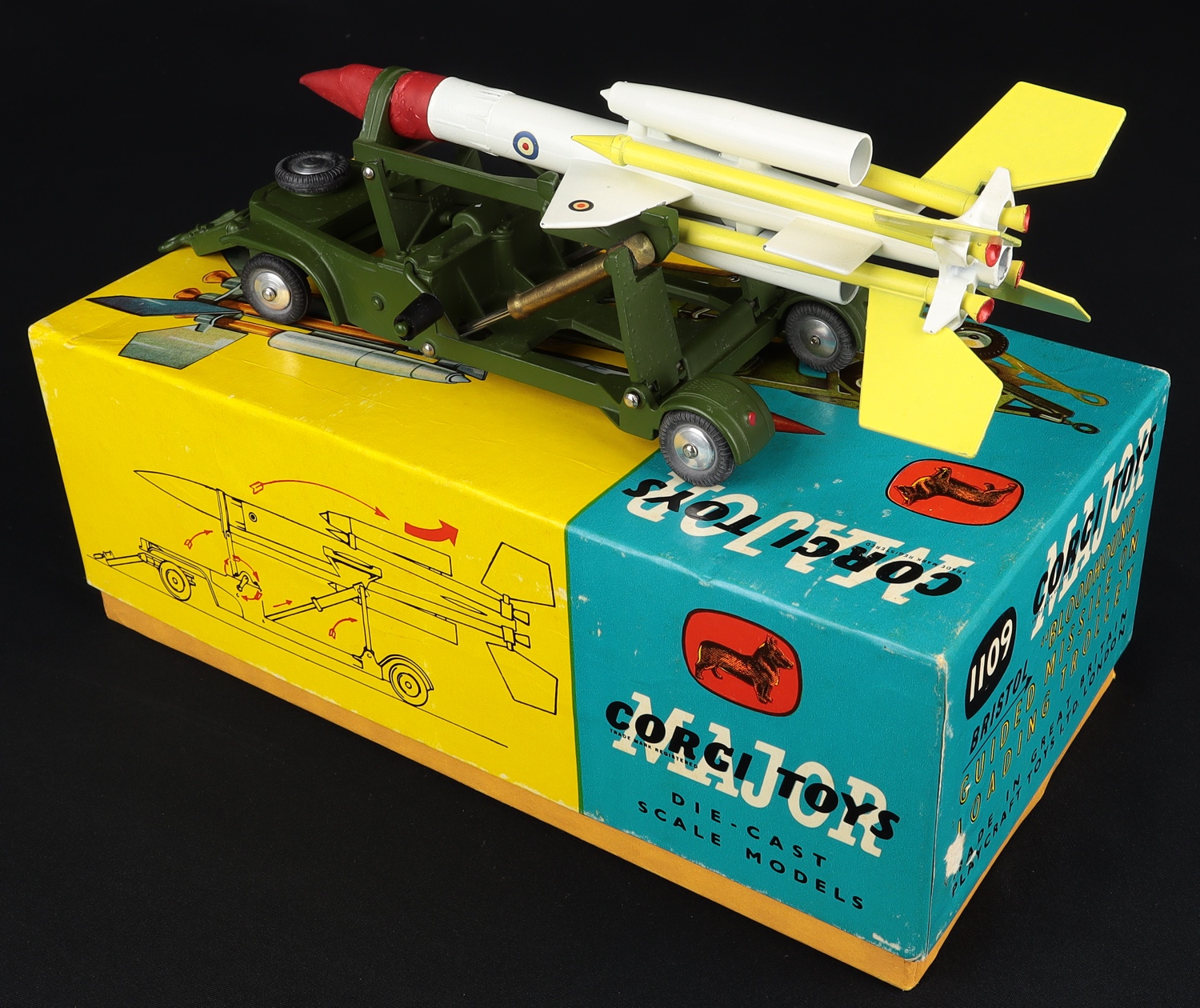 Corgi 1109 Bloodhound Guided Missile on Loading Trolley. Scarce early issue. Very near mint, with inner packing tray, Leaflet & Booklet. From The Pennsylvanian Collection.