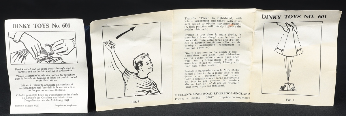 Austin Paramoke by Dinky Toys, No. 601. Early issue in card box. Complete with parachute and rarely found with BOTH Instruction Leaflets. Mint/boxed. From The Reference Collection.