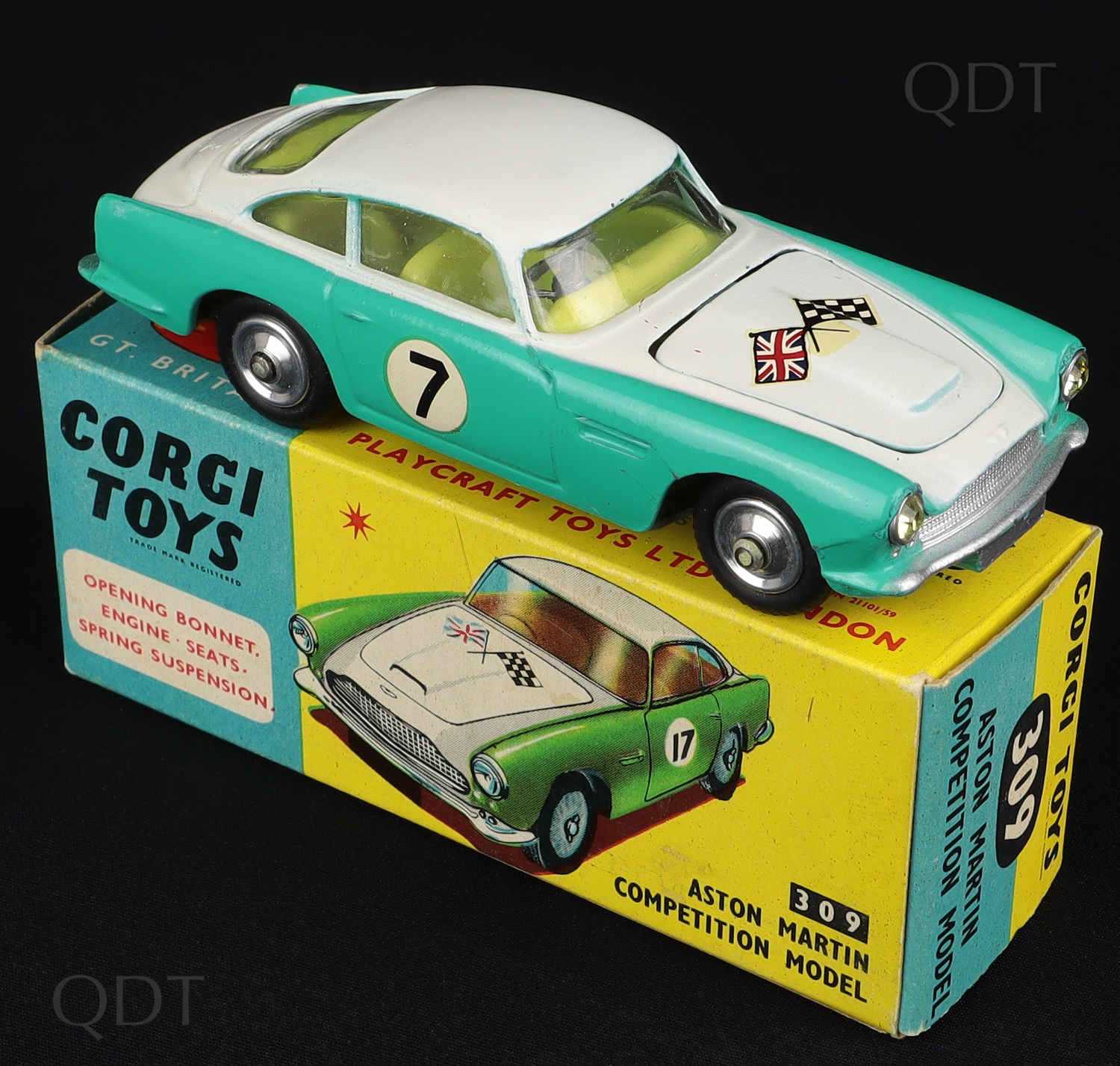 Aston Martin Competition Model by Corgi Toys, No. 309. BOLD Racing Number 7 . Very near mint/boxed. Scarce. From The Pennsylvanian Collection.