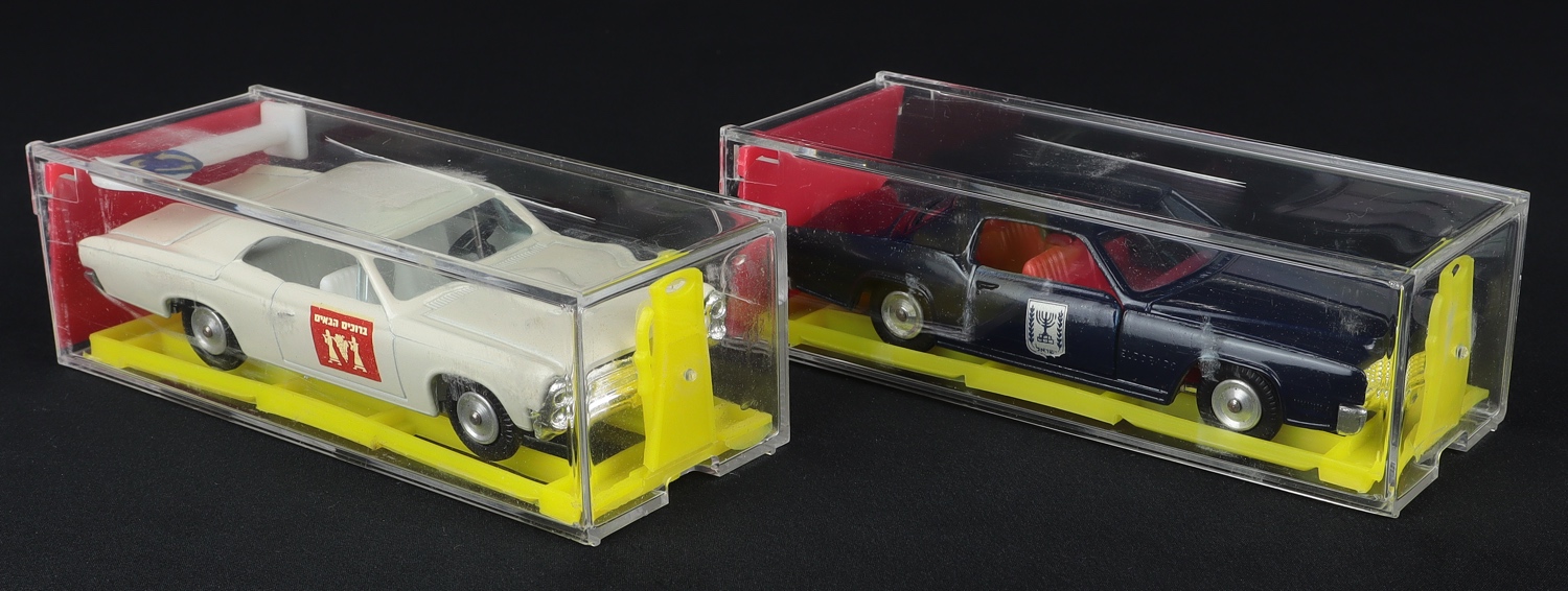 1) Sabra Models 8110 Cadillac Eldorado, in deep blue with small silver labels, with ISRAEL in Hebrew and with this striking image, a ministerial/official car (Knesset).