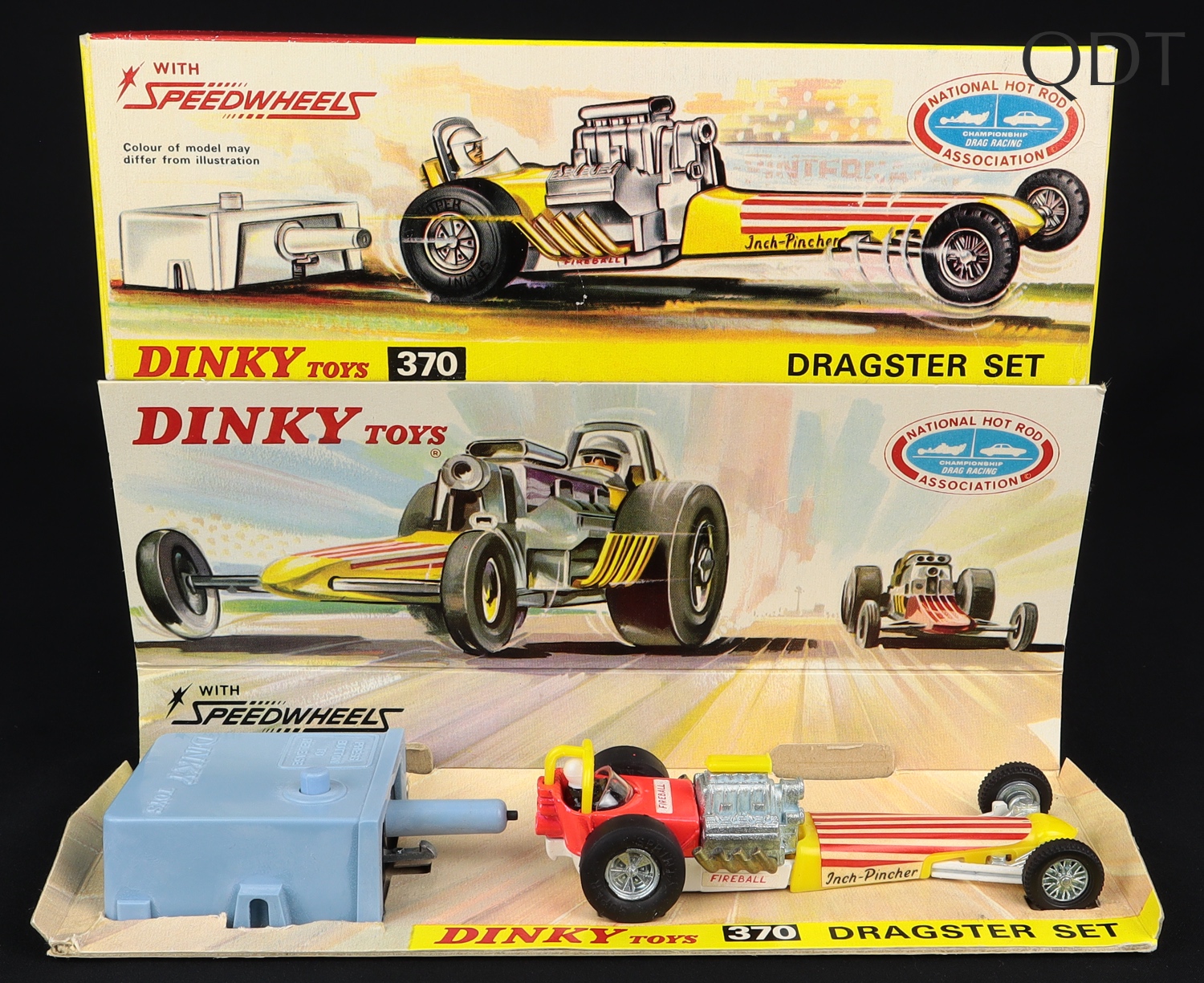 Dragster Set by Dinky Toys, No. 370. Very, very near mint/boxed. Early card box issue, with pictorial card plinth, foam packing & Leaflet. From The Swiss-French Collection. Starting bid £75. Please note that QDT apply 12.5% buyer's commission.