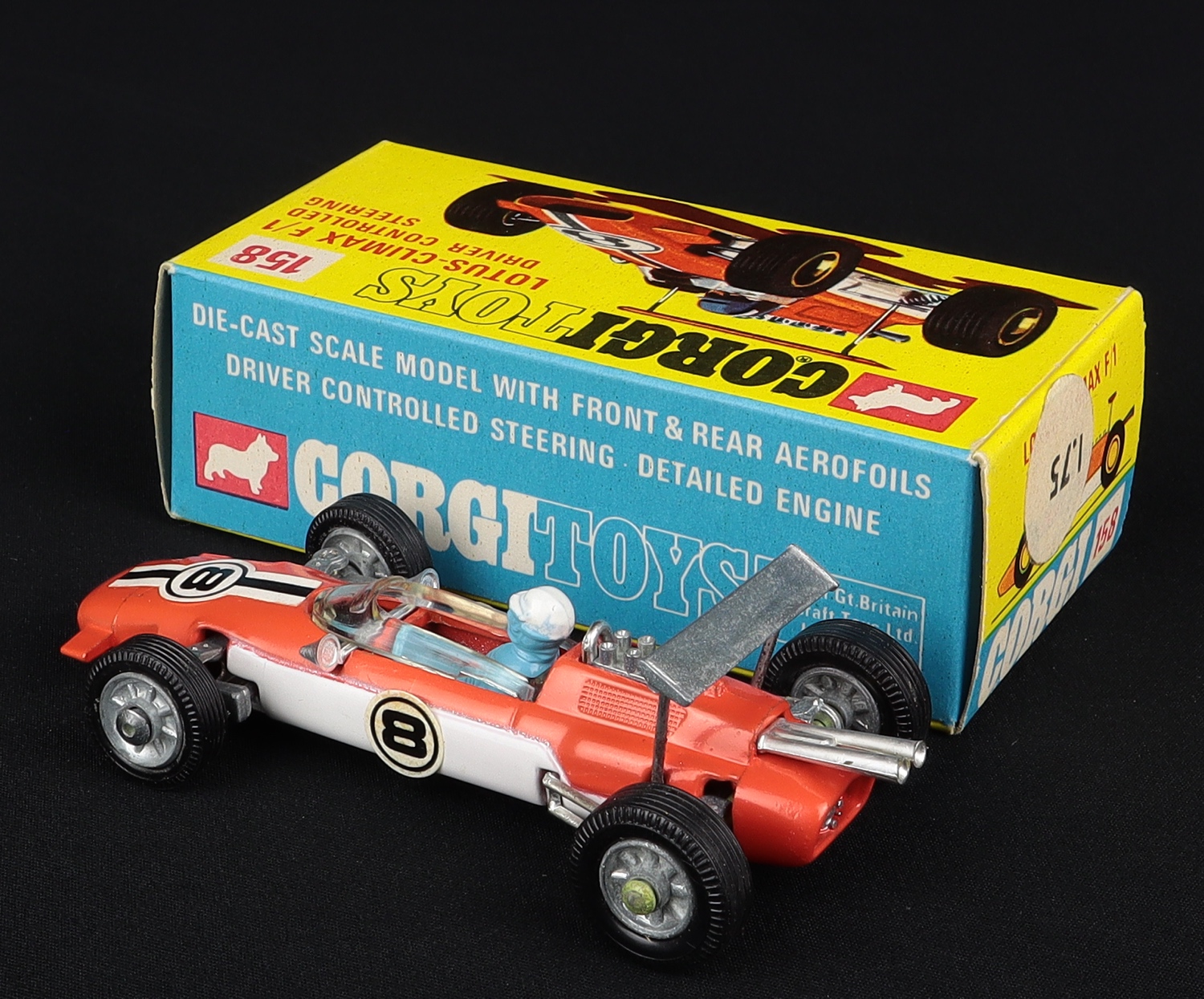 Lotus-Climax Formula 1 Car by Corgi Toys, No. 158. Very near mint /boxed. Shop-fresh early box. Complete with Model Specific Feature Leaflet & card packing piece. From The Cologne Collection.