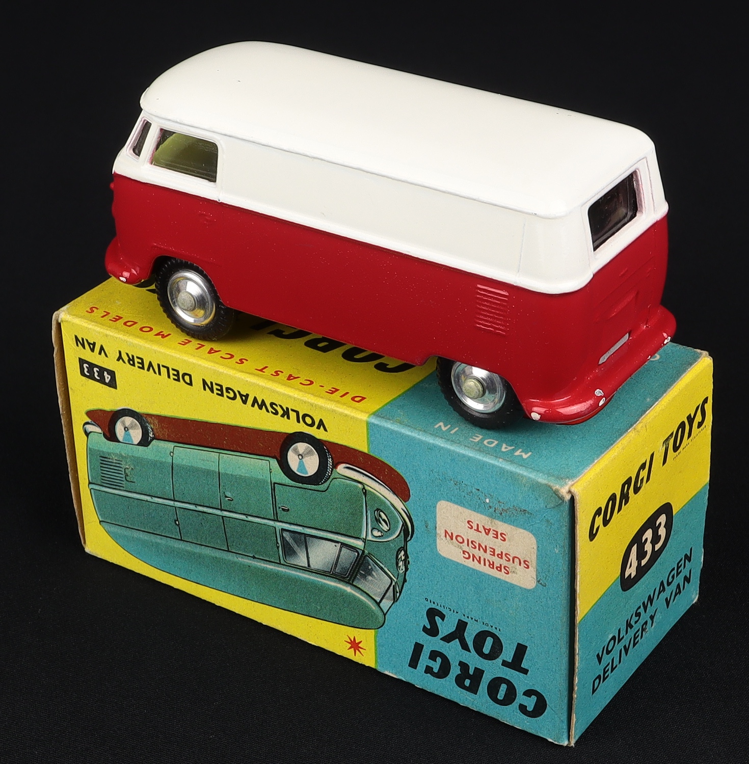 Volkswagen Delivery Van by Corgi Toys, No. 433. Red & white issue. With RED BUMPERS (not silver). Near mint plus/boxed (scribble on underside). From The Coastline Collection.