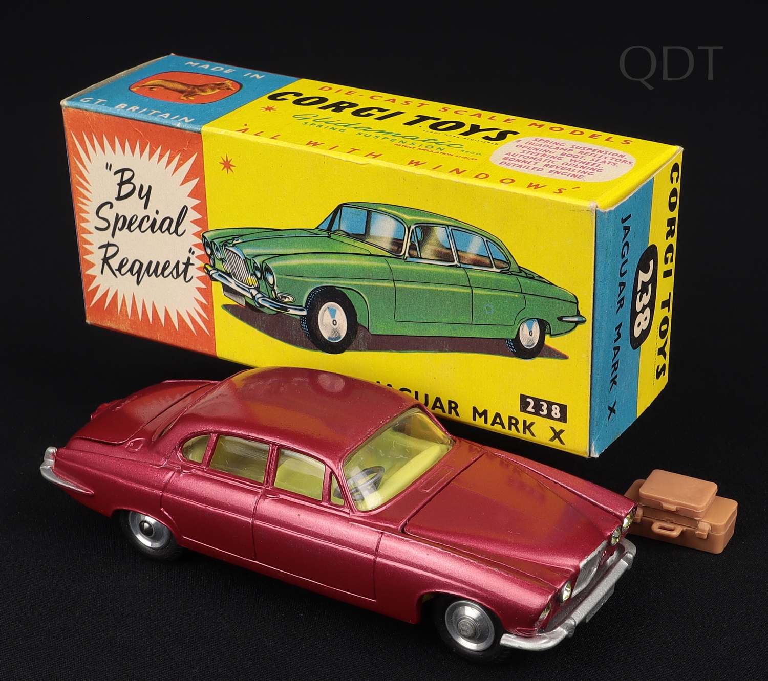 Jaguar Mark X by Corgi Toys, No. 238. Very near mint/boxed. Metallic mid-cerise issue. With both suitcases. From The Coastline Collection.