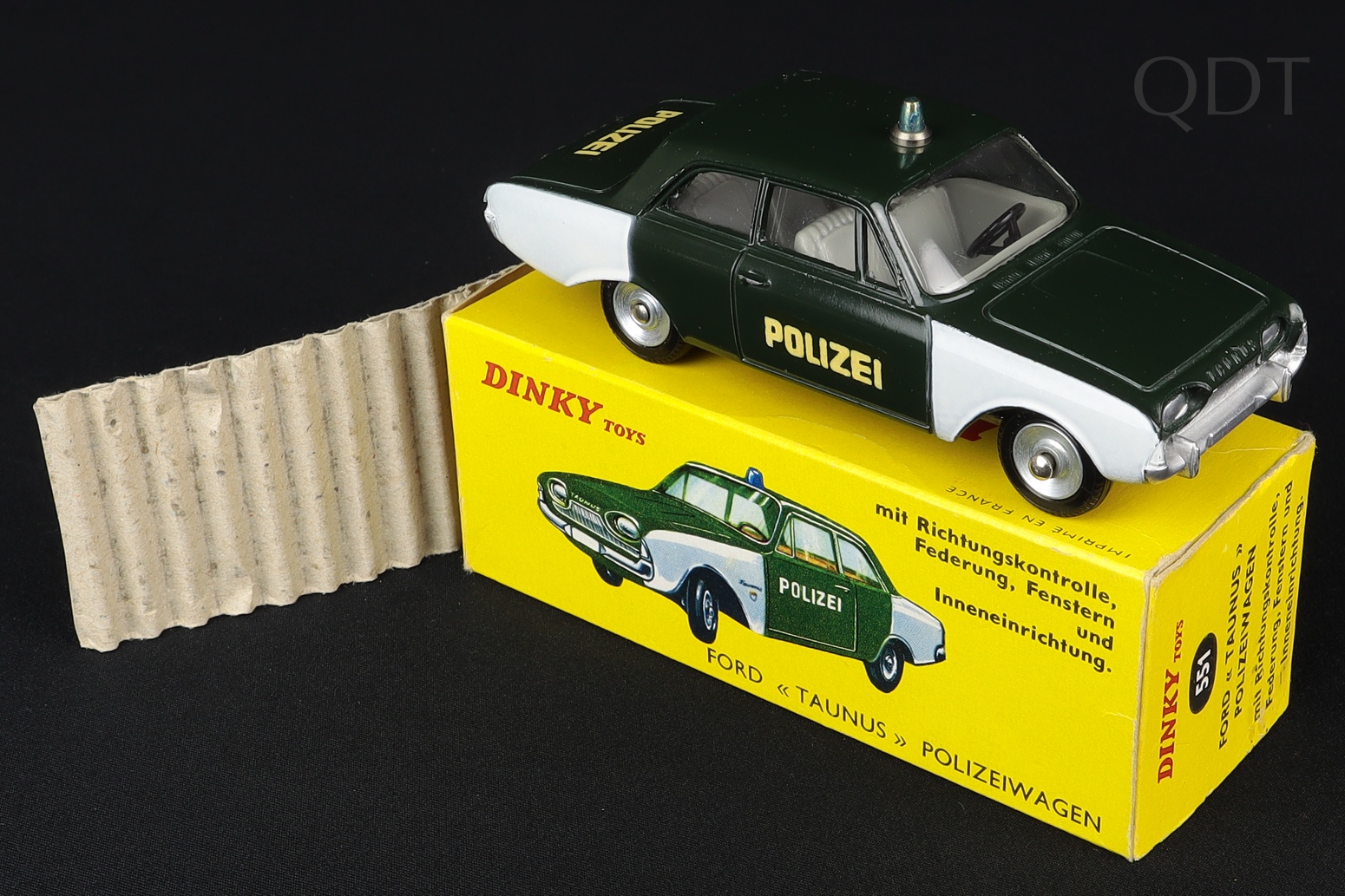 Ford Taunus 17M Police Car by French Dinky Toys, No. 551. Very near mint/boxed, with packing card. Very scarce German export model. From The Woodside Collection.