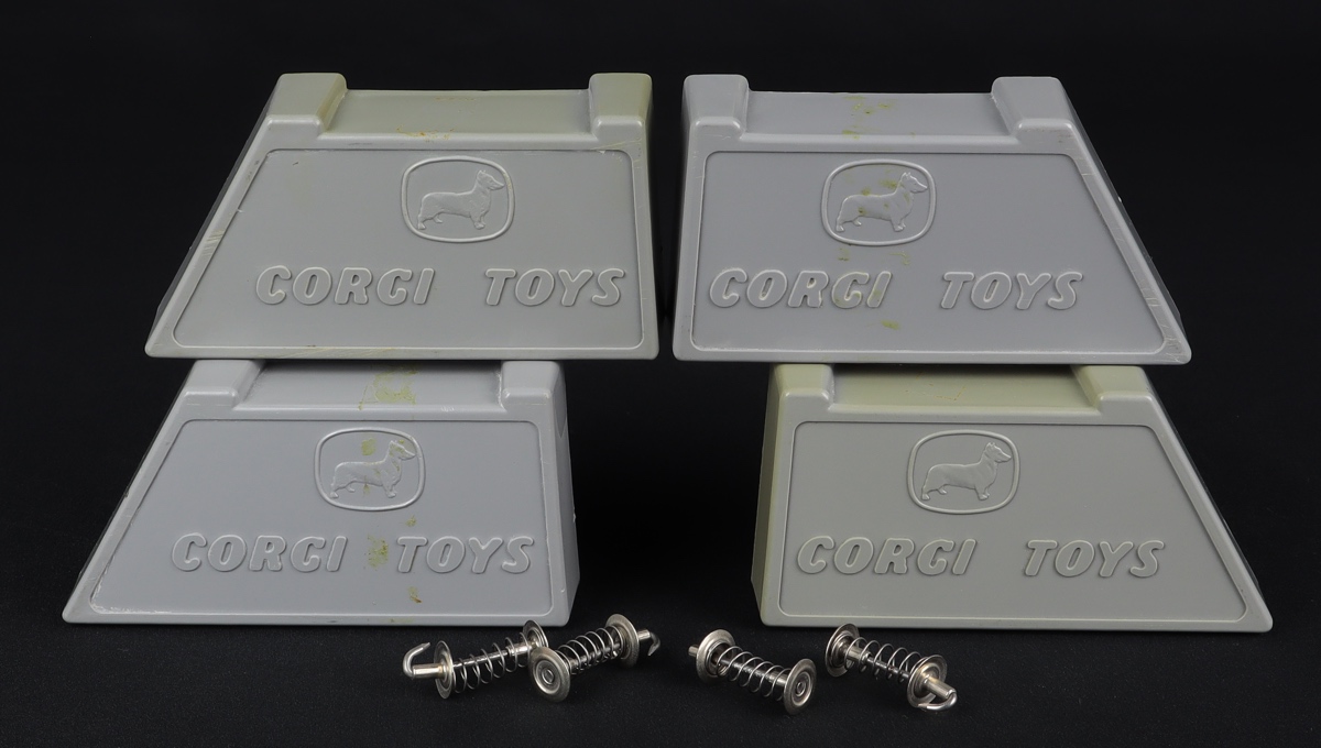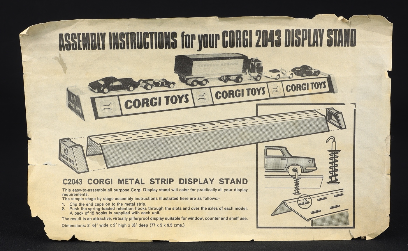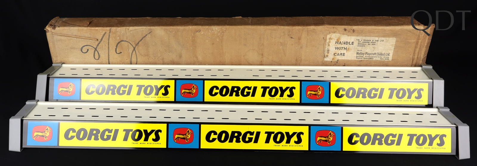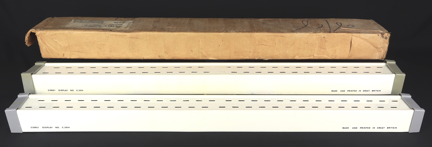 2 x Corgi Display Tin Shelves by Corgi Toys, No. 2034. Very, very near mint/boxed, with some original wrapping, Instruction Sheet & fixing accessories. Old shop stock period Corgi display items.