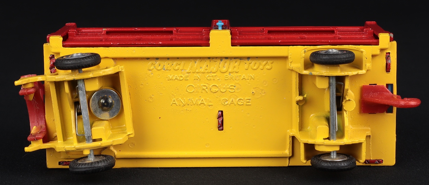 2) Corgi 1123 Circus Cage. Matching finish, complete with all blue plastic sliding doors intact. Notably, the amber roof lights are intact, too. Blue doors are still strongly-coloured. Bright shaped spun wheels and red plastic tow bar. Very close to mint condition.