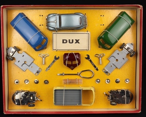 The set consists of the components to build 4 different vehicles as pictured on the colourful lid; a delivery van with green top and complete ‘DUX 61’ transfers, a Combi in blue, a open delivery van with maroon cab and of course, the VW Beetle in silver-blue with one-piece oval rear window.