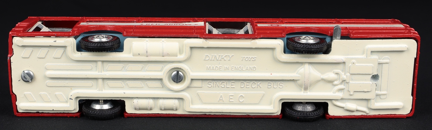 An attractive Dinky bus with operable opening doors and even a button operated bell! A delightful Dinky ‘Red Arrow’ bus with a vivid, original non-metallic red paint finish and intact and complete paper labels on both sides. Detailed cast wheels and fine tread original tyres.