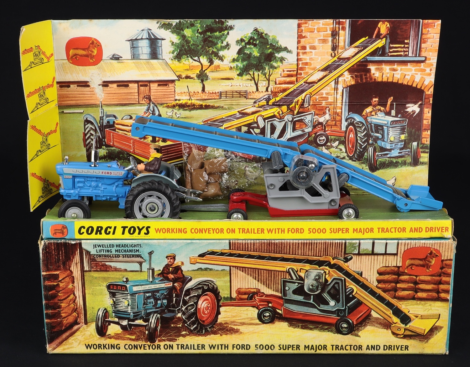 Working Conveyor on Trailer with Ford 5000 Super Major Tractor & Driver by Corgi Toys, Gift Set No. 47. Version with CHROMED Chimney Stack. Near mint plus - very near mint/boxed. From The Kennedy-Wilson Collection.