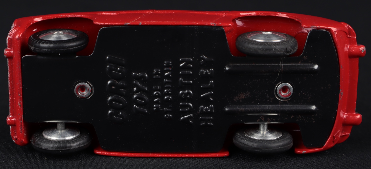 Austin Healey Sports Car by Corgi Toys, No. 300. Very, very near mint/boxed. Scarlet red version with flat spun wheels & SILVER steering wheel.