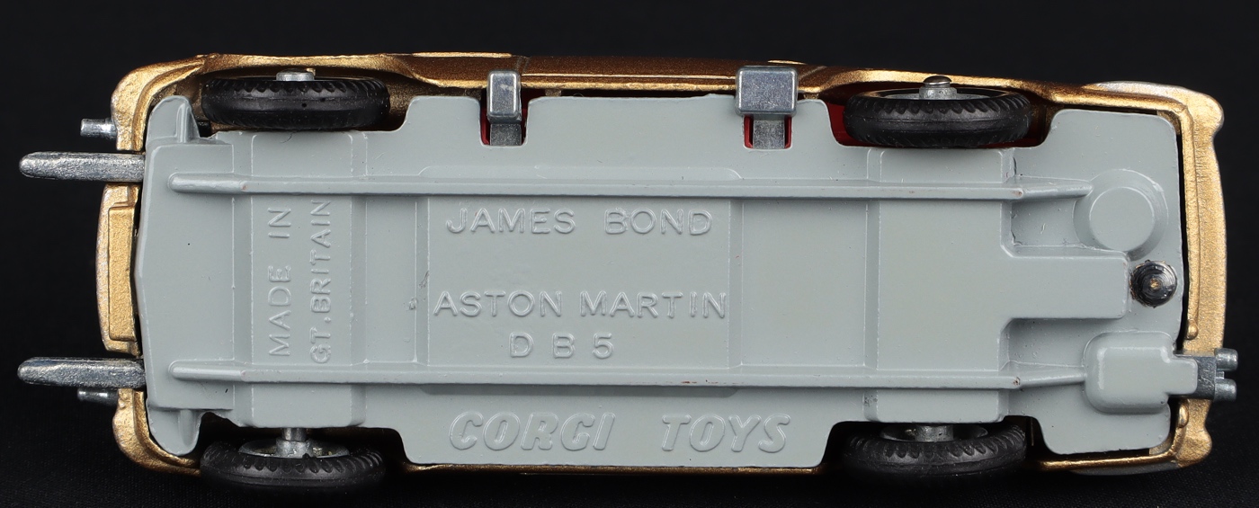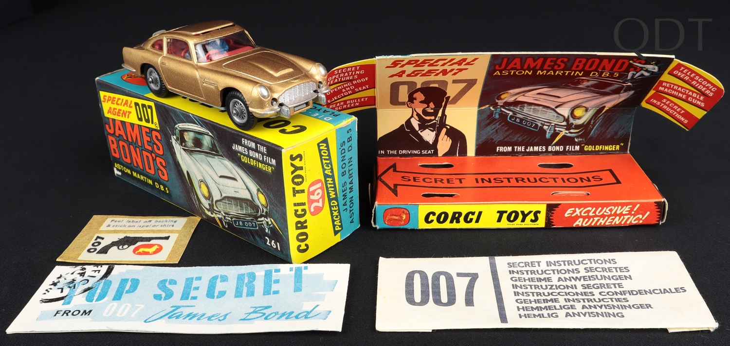 James Bond's Aston Martin D.B.5 by Corgi Toys, No. 261. Bright gold issue. Very near mint/boxed. 1st issue WITH INDICATOR LIGHT CASTING. 2nd issue style box with full Instruction Packet & 'Model Car Makers to James Bond' Brochure. Pristine card plinth.