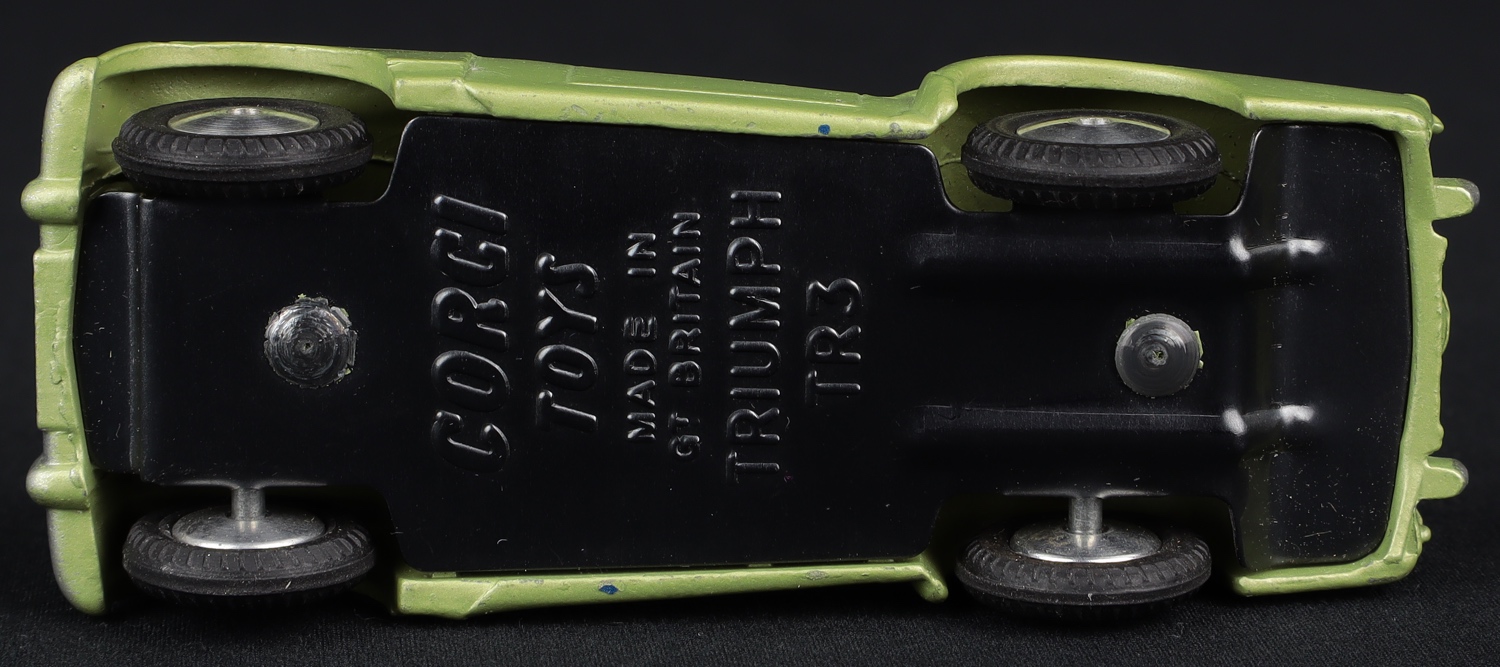 Triumph TR3 Sports Car by Corgi Toys, No. 305. Mint/boxed. Metallic olive green version with flat spun wheels & SILVER metal steering wheel. Scarce. Exceptional. From The Heart of England Collection. QDT starting bid £125. Please note that QDT apply 12.5% buyer's commission.