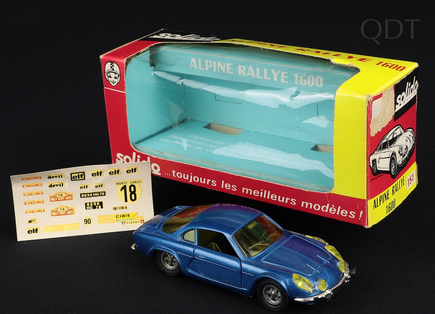 Alpine Rallye 1600 by Solido Models, No. 181. Metallic blue. Very near mint/boxed, with transfer sheet. From The Berlin Collection.