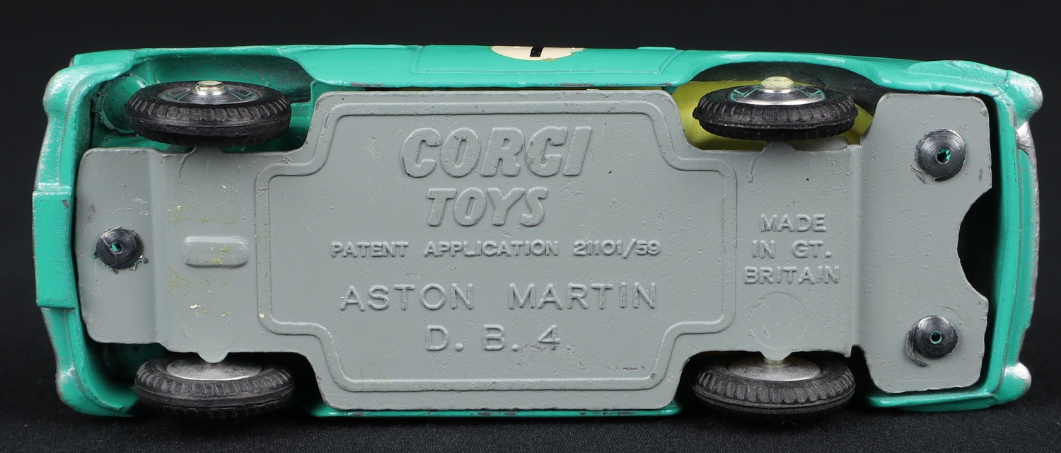 This Corgi Toys 309 Aston Martin Competition model is sought-after and one of the key items in the Corgi Gift Set 15 Silverstone Set. This example has a shining turquoise and white finish, lemon interior, complete crossed flags on the bonnet, suspension on shining shaped spun hubs, jewelled headlights, racing number 1.