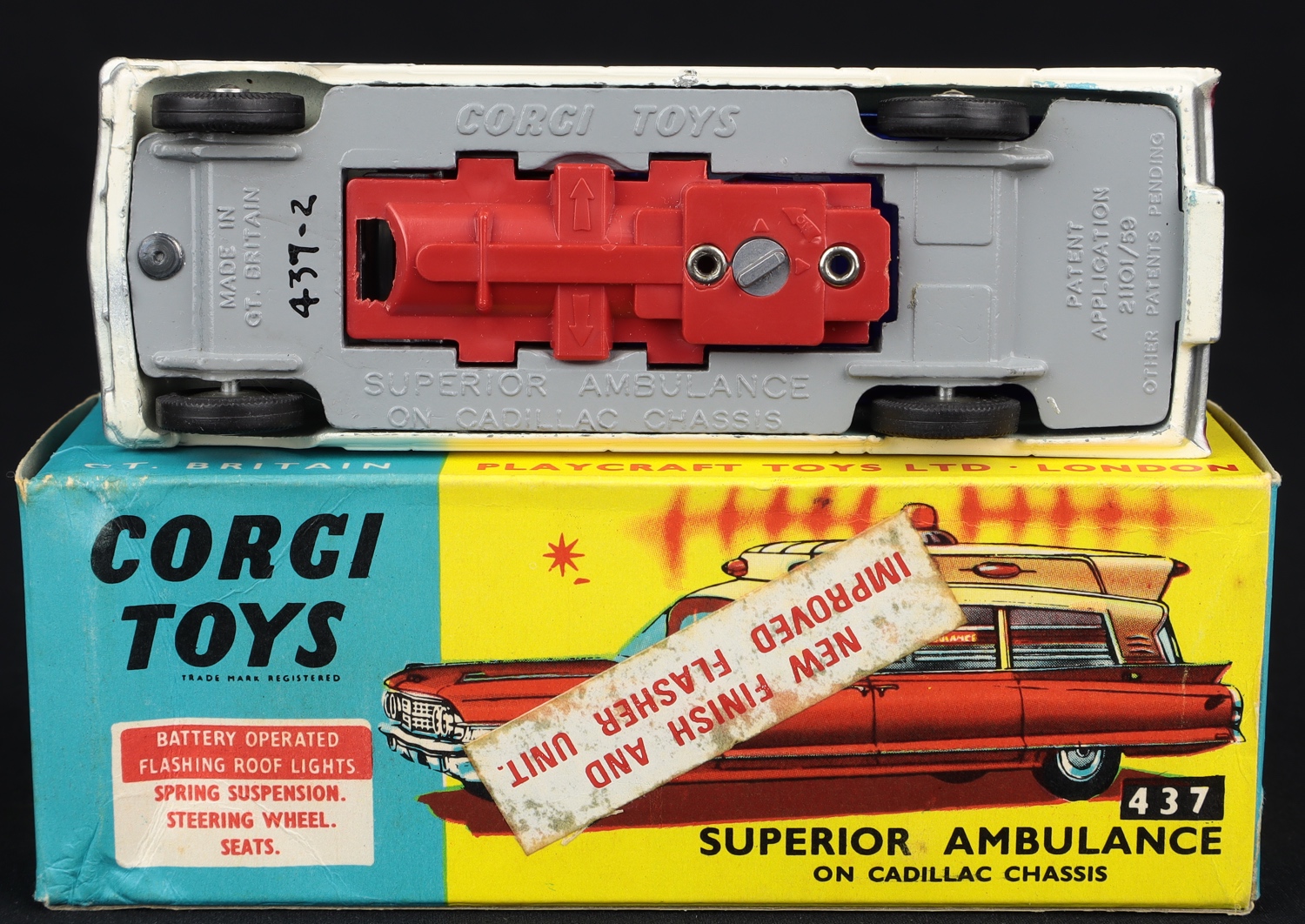 Superior Ambulance on Cadillac Chassis by Corgi Toys, No. 437. Spun wheel issue. Very near mint/boxed. With Instruction Leaflet & Card Packing pIece . From The 25 Year Collection in California.