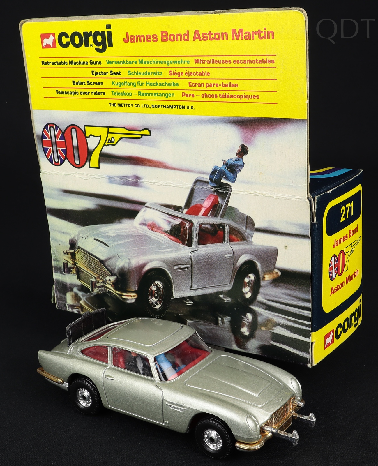 James Bond Aston Martin by Corgi Toys, No. 271. Silver version with twelve-spoke wheels. Very near mint/boxed, with bagged villains. With GRAPHITE GREY BULLET SHIELD, & 1 LEVER, gold trim & Swedish print on box base. Dated 1977. Header card, 1:36 scale tagged box. From The Berlin Collection.