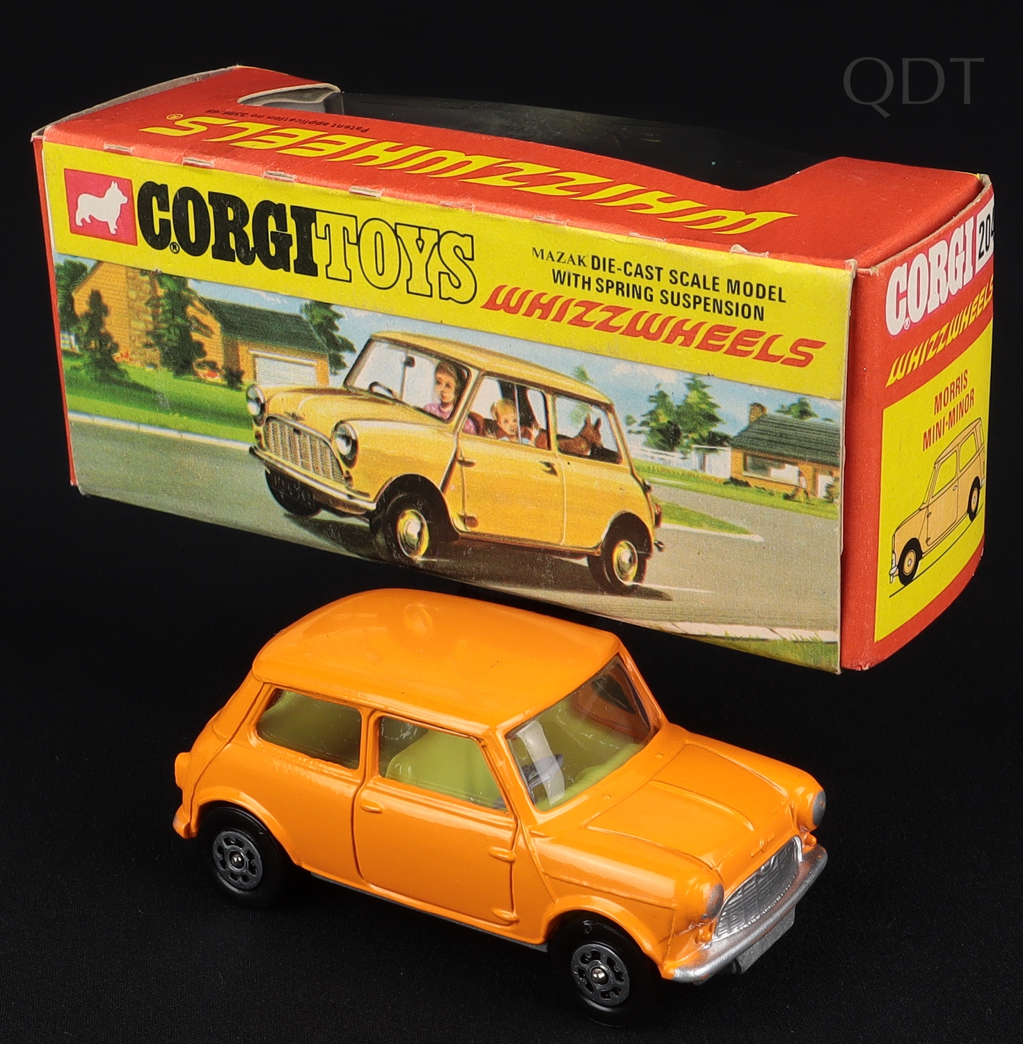 Morris Mini Minor by Corgi Toys, No. 204. Orange with yellow interior. Clear screens. Very, very near mint/boxed. From The Bluehouse Collection of fine Corgi.