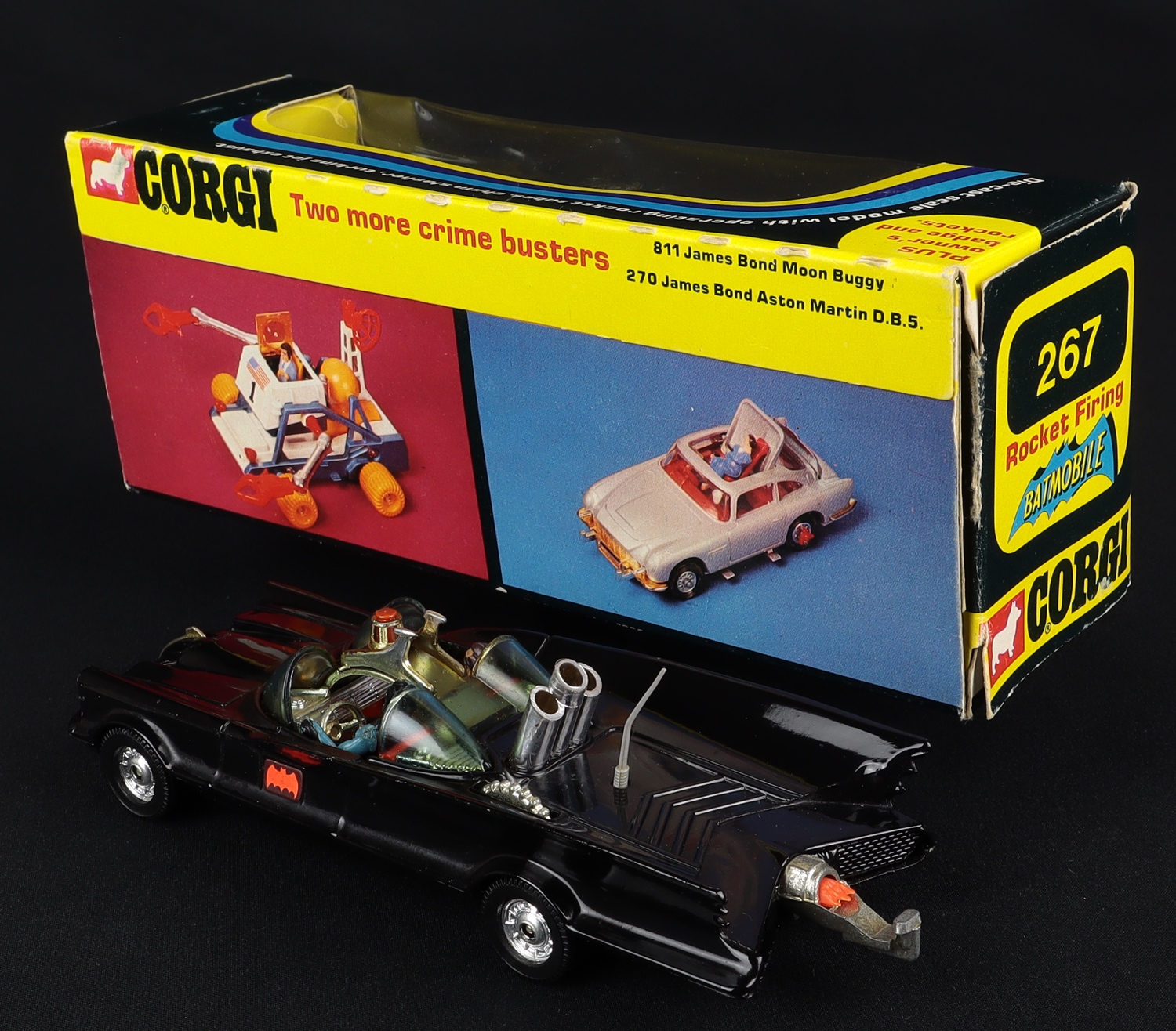 Batmobile by Corgi Toys, No. 267. PALEST BLUE screens & narrow 12 SPOKE WHIZZWHEELS.'Brass' coloured button on bonnet and section between the figures. Early issue narrow window box. Near mint/boxed. With sealed Secret Instruction Packet. From The Bluehouse Collection of fine Corgi. QDT starting bid £200. Please note that QDT apply 12.5% buyer's commission.