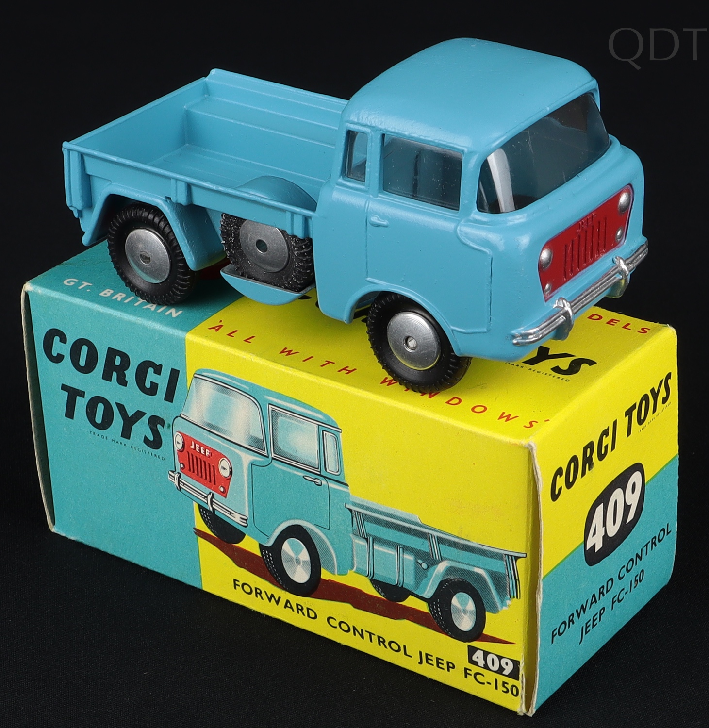 Forward Control Jeep by Corgi Toys, No.409. In light gloss blue. Flat spun wheels. Very, very near mint/boxed. Very crisp! From The Sverige Collection. QDT starting bid £125. Please note that QDT apply 12.5% buyer's commission.