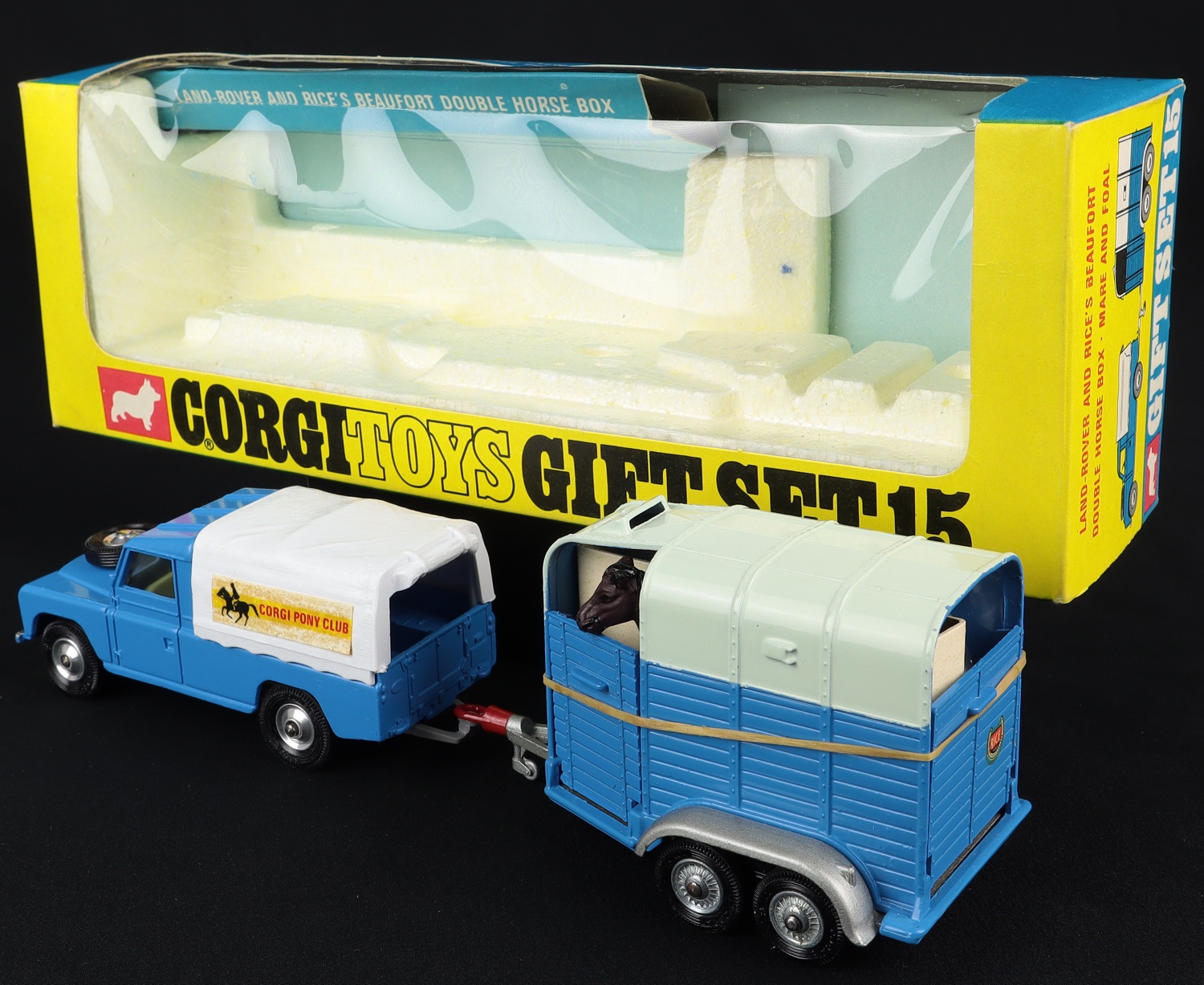 Land-Rover And Rice's Beaufort Double Horse Box with mare & foal by Corgi Toys, Gift Set No. 15. Transition issue with combination of different wheel types. Very near mint/boxed, with card insert, leaflet & card packing. From The Fenman Collection.