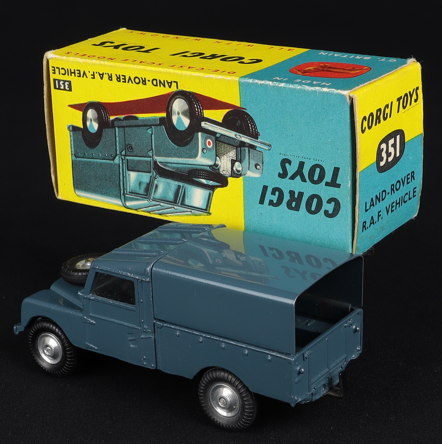 Land-Rover RAF Vehicle by Corgi Toys, No. 351. Harder to find SHAPED SPUN wheels issue, with cast bumper and struts. Very near mint/boxed. From The Reference Collection.