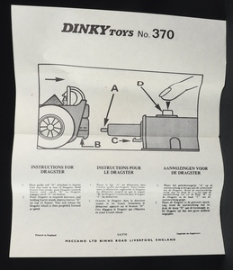 Dragster Set by Dinky Toys, No. 370. Very near mint/boxed. Early card box issue, with pictorial card plinth & Leaflet. With Meccano News Bulletin from 1969, black and white Press Photo & Promotional stiff card Sign. A rare assemblage from The Wesley Lodge Collection. QDT starting bid £150. Please note that QDT apply 12.5% buyer's commission.