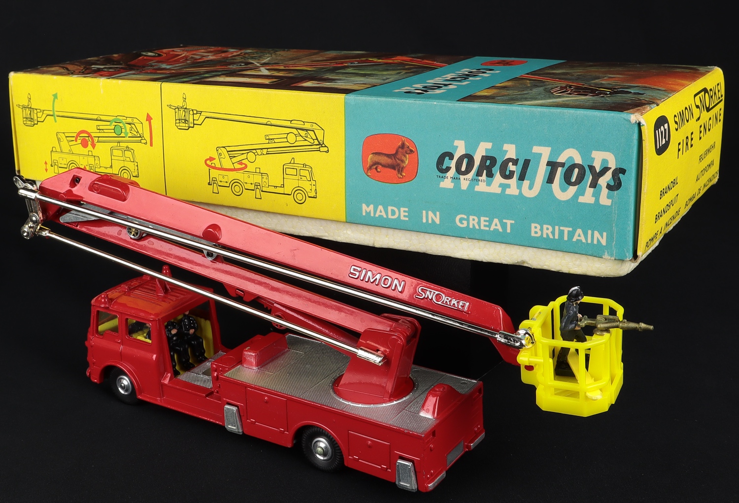 Simon Snorkel Fire Engine by Corgi Toys, No. 1127. With spun wheels. Very near mint/boxed. Early issue in bright, fresh card box, with leaflet. From The Kingshill Collection.