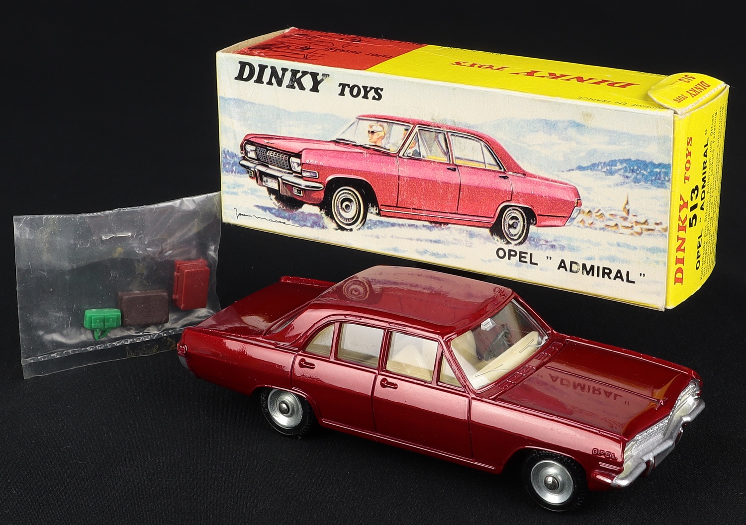 Opel "Admiral" by French Dinky Toys, No. 513. Deep metallic red, cream interior. *With 3 pieces of luggage*. Very near mint/boxed, with tag. From The Brighton Collection.