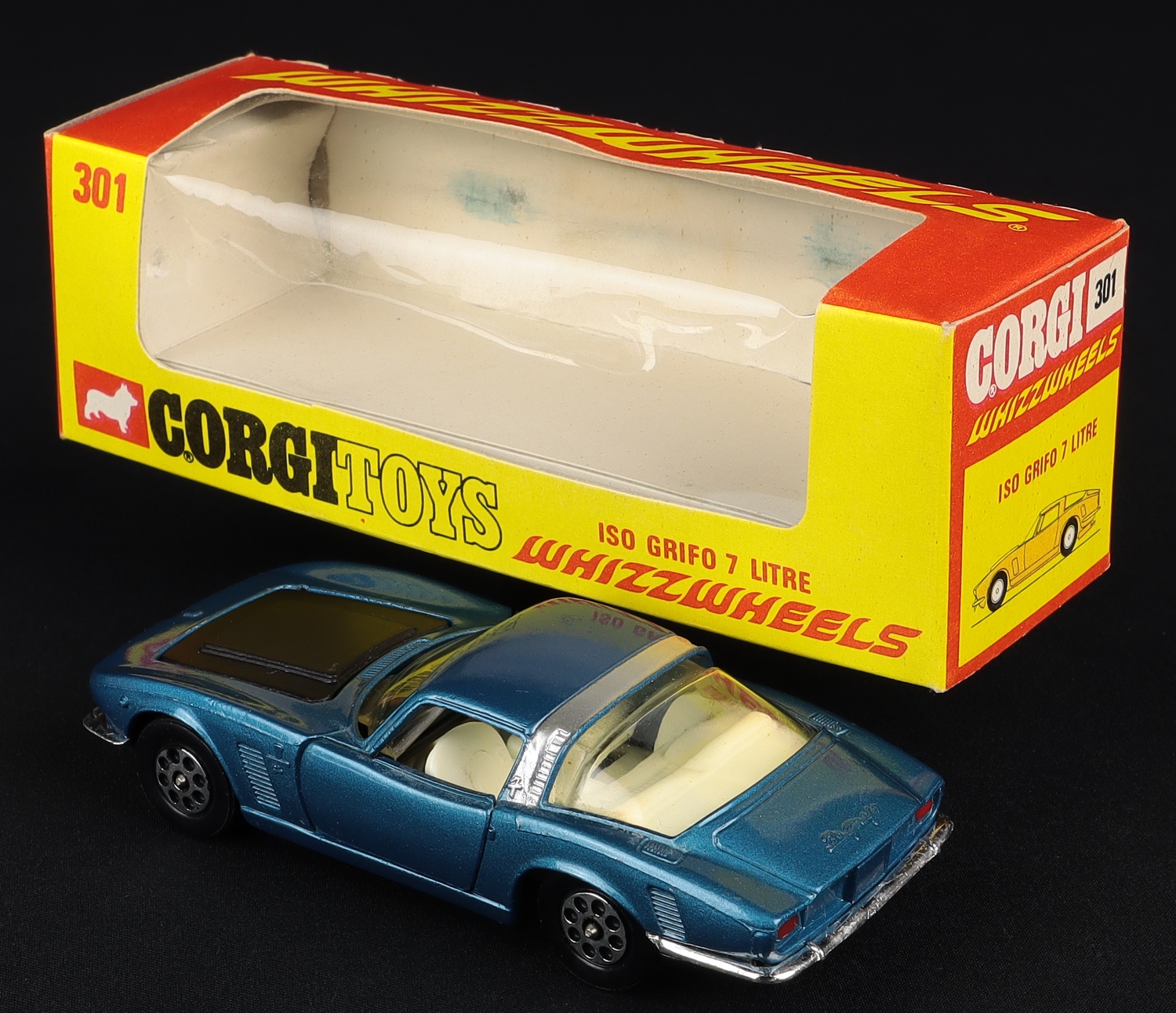 Iso Grifo 7 Litre by Corgi Toys, No. 301. Metallic blue with silver roll bar & cream interior. 'Pepperpot' whizzwheels. Very near mint/boxed. From The Berlin Collection.