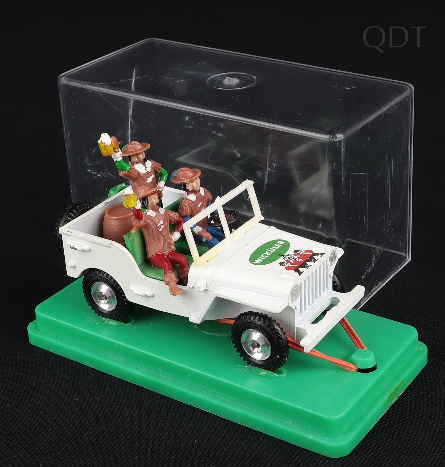 From this well-regarded German manufacturer, this 1:43 scale white Jeep has a perfect, colourful "WICKULER’ bonnet label, all 3 figures still firmly in place with the barrel stowed. Shiny shaped spun wheels. Fine original tyres. All delicate parts intact.