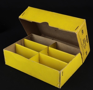The sturdy yellow lift-off lid card Trade box is complete and bright. Correct colour spot on this dual-numbered Trade Box. Light wear/corner scuffs and grubbiness. Small corner crush.