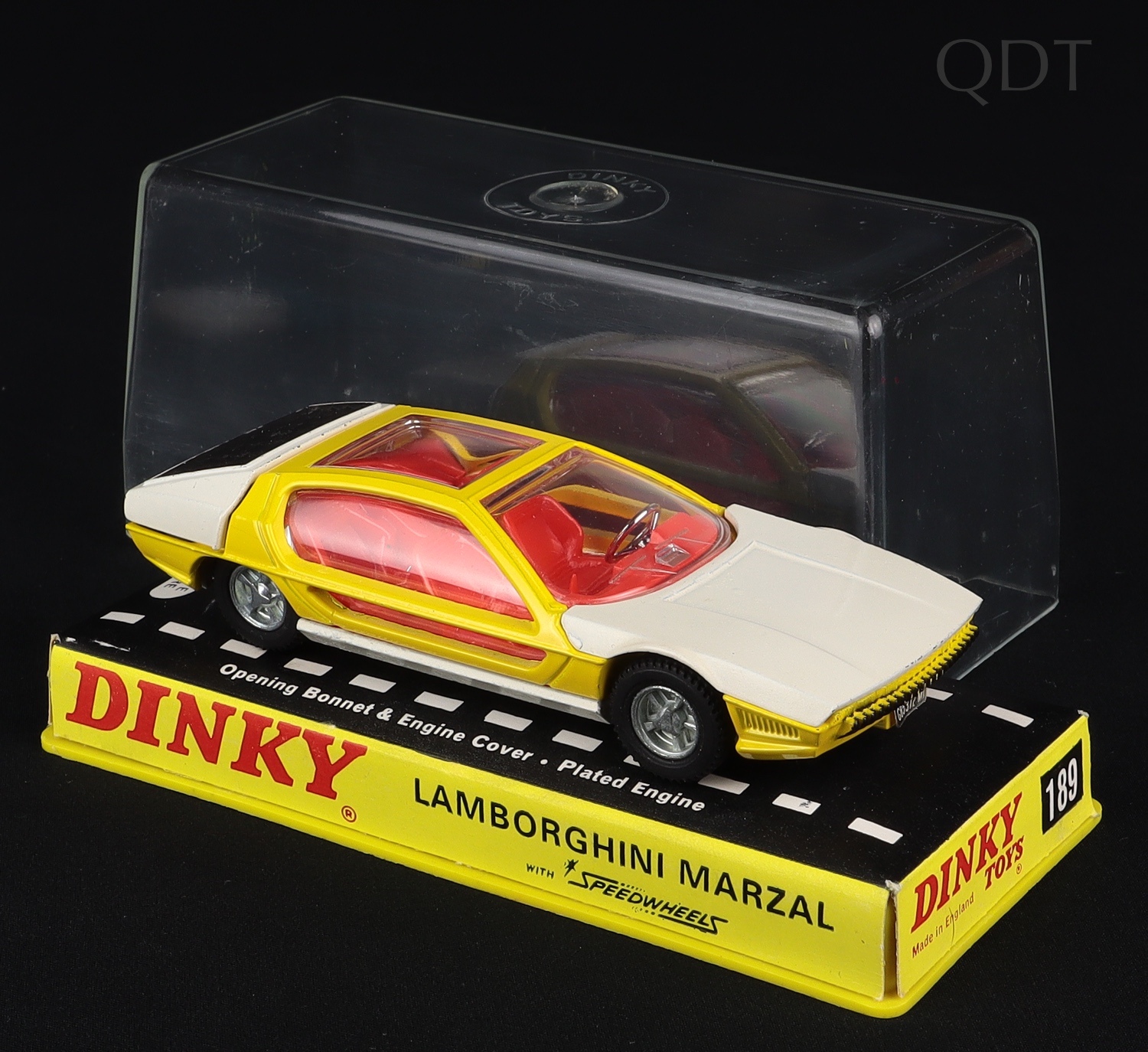 Lamborghini Marzal by Dinky Toys, No. 189. Yellow & white with RED interior. Very near mint/boxed. Early issue with cast wheels. From The Reference Collection. QDT starting bid £75. Please note that QDT apply 12.5% buyer's commission.