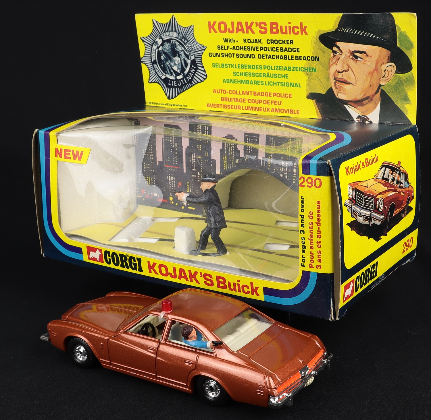 Kojak's Buick by Corgi Toys, No. 290. Very, very near mint/boxed. With both correct figures, detachable roof light and badge. Harder to find version with KOJAK'S Buick print on box.