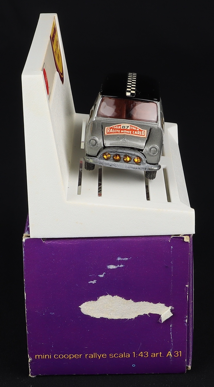 Distinctive card end flap style box has Mini Cooper Rally Monte Carlo images and product range information on one side. Note the area of surface loss to an end flap.