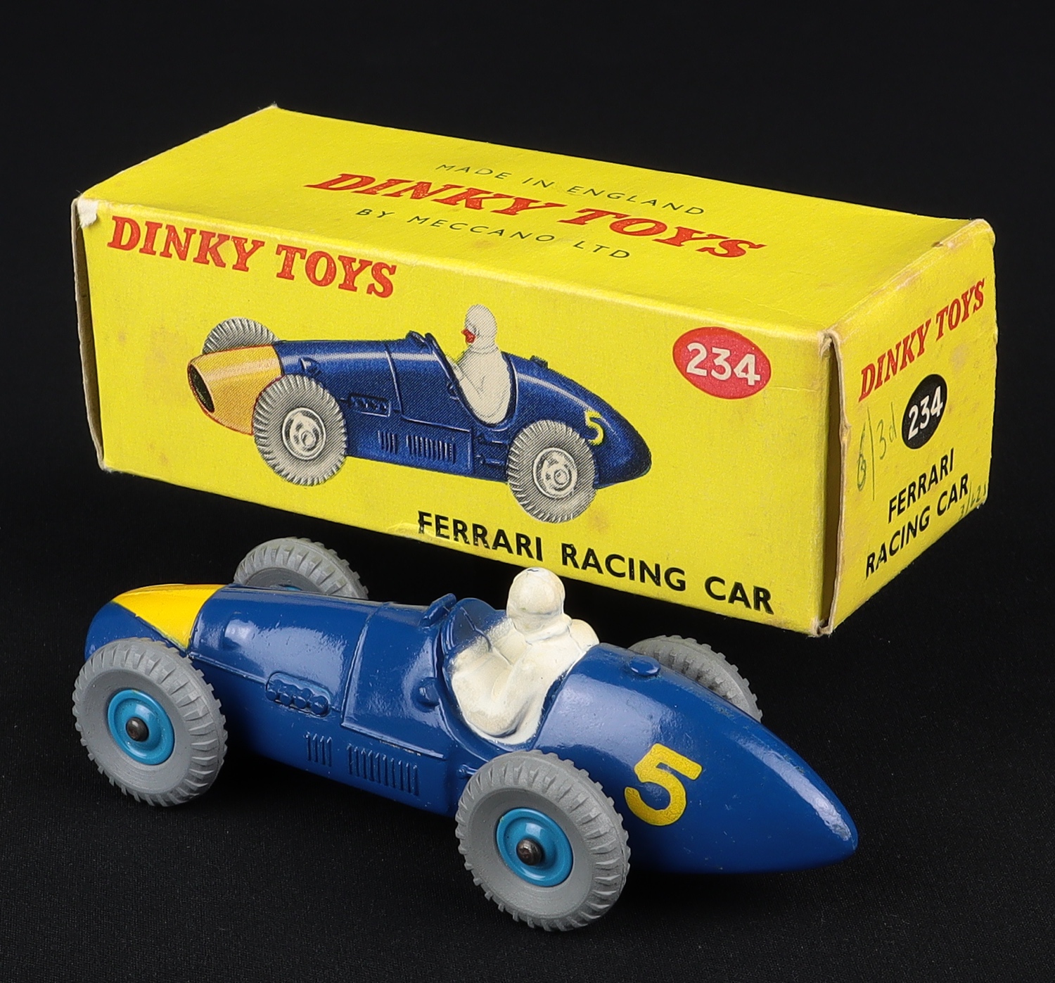 Ferrari Racing Car by Dinky Toys, No. 234. Very near mint/boxed. Scarce 'shark nose' version with BLUE PLASTIC wheels. From The Ground Crew Collection.