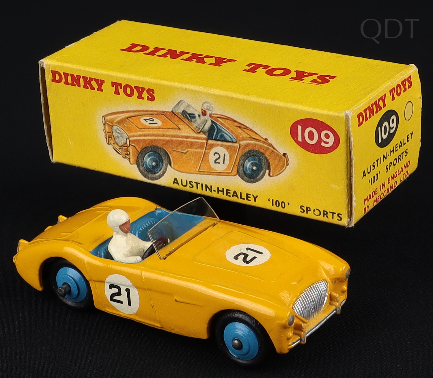 Austin-Healey '100' Sports by Dinky Toys, No. 109. Orange-yellow version. Very near mint/boxed. From The Ground Crew Collection.