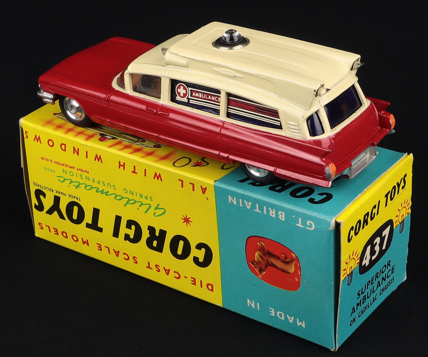 Superior Ambulance on Cadillac Chassis by Corgi Toys, No. 437. Red and deeper cream version with roof light & clear indicators. Near mint plus/boxed, with Instruction Leaflet & card packing piece. From The Fenman Collection.