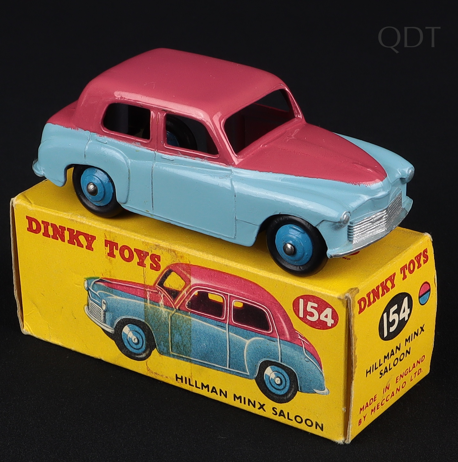 Hillman Minx Saloon by Dinky Toys, No. 154. Very near mint/boxed (wear) Scarce two-tone issue in pale blue and cerise. From The Ground Crew Collection.