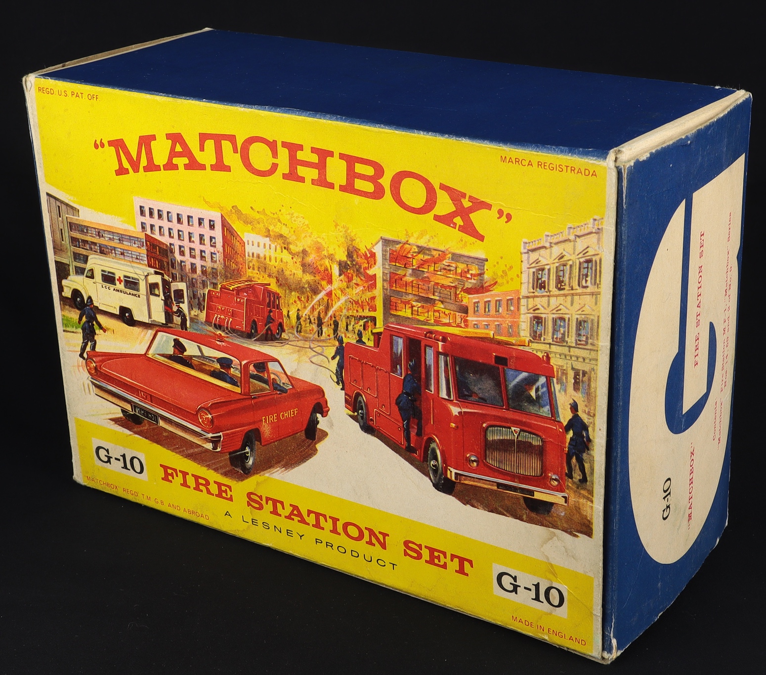 Fire Station by Matchbox, Gift Set No. 10. Includes 4 assorted boxed Emergency Vehicles. Near mint plus - very near mint/boxed. Scarce set from an eclectic collection. QDT starting bid £200. Please note that QDT apply 12.5% buyer's commission.
